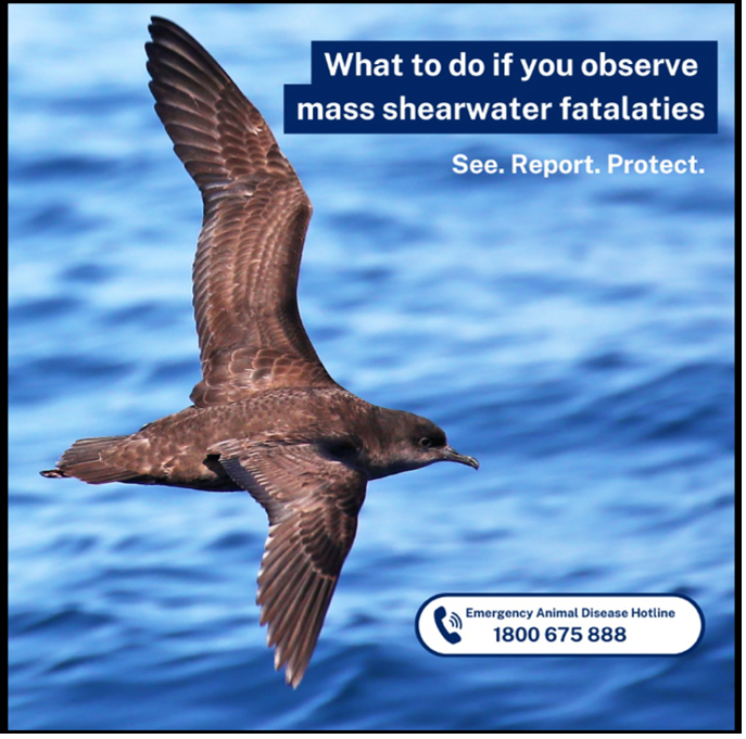 Testing of some shearwater carcasses has been undertaken by government agencies and there is no indication that the deaths are a result of the H5N1 high pathogenicity avian influenza (H5 bird flu), which has been causing mass wildlife mortalities overseas. State biosecurity agencies are continuing to monitor reports of shearwater and other bird mortalities.