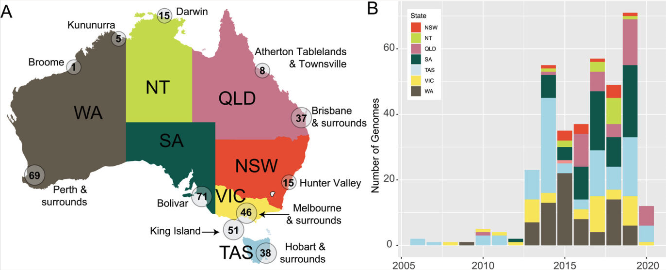 Creative Commons Spatial and temporal distribution of avian influenza genomes by Wille et. al. 2022 in 'Australia as a global sink for the genetic diversity of avian influenza A virus' is licensed under CC BY 4.0